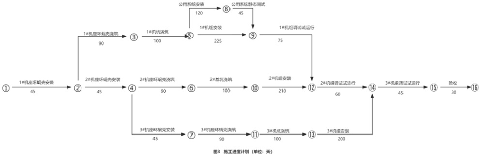某水电站安装3台立式混流式水轮发电机组,发包人与承包人依据《水利水电工程标准施工招标文件》(2009年版)签订了施工承包合同,施工内容包括机组安装和混凝土浇筑,1#机组位首台发电机组,经监理人批准的进度计划如图3所示。