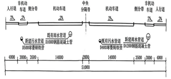 某公司承建一项城市主干路扩建工程,全长2.2km。施工内容包括:既有双向四车道改造为双向八车道、原机动车道水泥混凝土路面加铺沥青混凝土面层、既有管道更新修复、新建雨水及污水管道、绿化等,改扩建后道路典型横断面如图1所示。