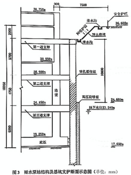 雨水泵站结构及基坑支护断面如图3所示。施工过程中发生如下事件:
