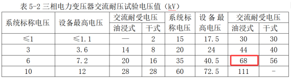 3.(1)T11的额定电压为35KV,根据背景:三相油浸式电力变压器(6300KVA-35KV/10KV),”属于油浸式电力变压器,根据表格,交流耐压试验应选用68KV