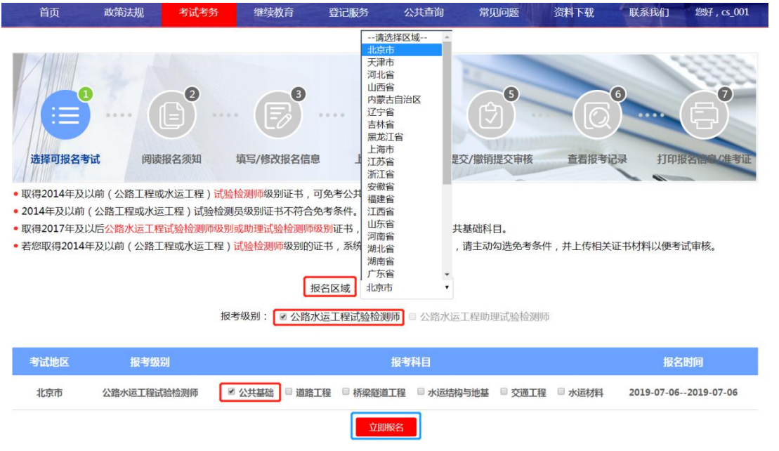 点击报名区域,选择需要报考的省份,勾选需要报考的级别,以 及选择需要报考的科目,同一考试时间的科目只允许选择报考一科, 页面中的证书信息提示考生已获得的证书和通过的科目以及免考科 目,如图所示。选择完成后点击立即报名。进入下一报名环节。