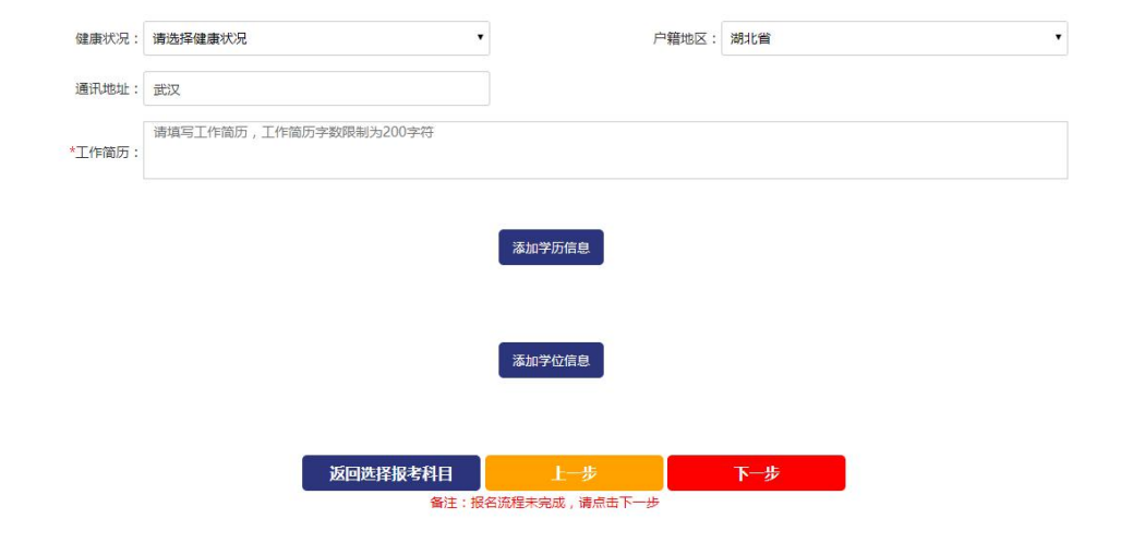 考生完善填写个人信息,填写个人信息需真实有效 要点说明:表单中红色*号标记为必填;工作年限需按照考生实 际情况填写;单位名称应填写单位全称不得简写;如非在职的报考人 员请在单位名称中填写“无”;工作简历字数限制为 200。信息填写 完成后,点击下一步进入附件上传环节。