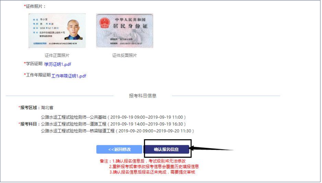 附件材料上传完成后,点击下一步是考生再次确认填写的信息, 如下图。点击确认报名信息按钮的后进入下一环节。