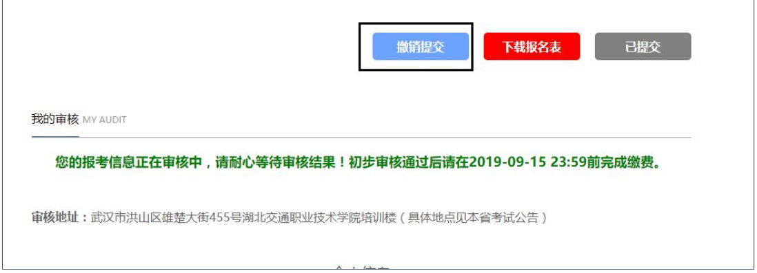 考生提交审核后,如发现报考信息需要重新修改情况的,考生可直接点击“撤销提交”撤回,但撤回的前提是省级管理员未审核。
