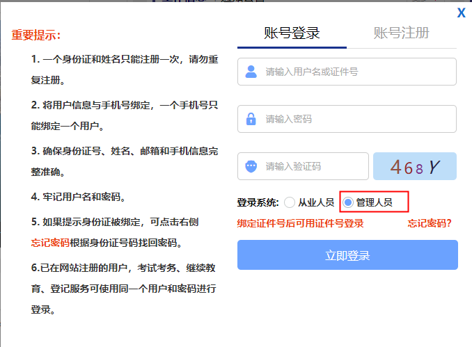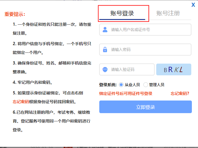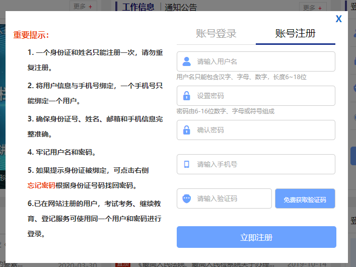 考生打开网站登录链接后,点击登录|注册按钮,网站页面弹出账号登录、账号注册选项,填写用户名、密码,注册时必须通过手机发送验证码的方式进行注册,如下图所示。