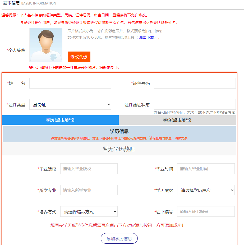 报名前考生必须上传个人照片、姓名、证件类型、身份证号码、民族、学历信息、学位信息、通讯地址等相关信息填写完成后点击保存,注册时填写的信息请谨慎如实填写。