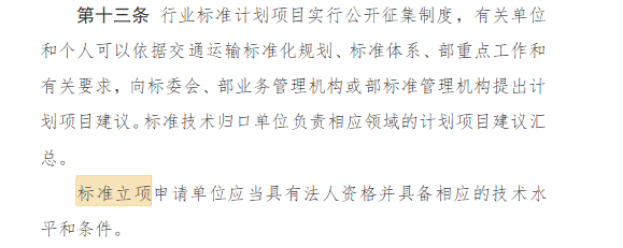 根据《交通运输行业标准管理办法》(交科技发[2024]1号),标准立项中申请单位应当具有法人资格并具备相应技术的水平和条件。