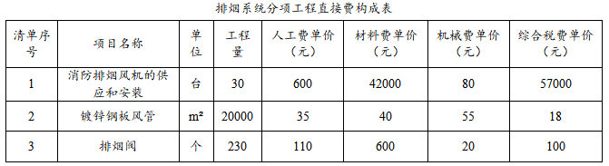 项目部根据工程特点、施工方案和自身的技术管理实力,广泛调研工程所在地的劳动力、材料、设备等资源状况,利用工程量清单,按照项目成本的构成编制项目成本计划,项目的计划成本降低率为6%,其中排烟系统的工程量清单分项工程直接费构成见下表。