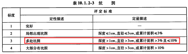 10)水泥混凝土桥面铺装多处坑洞,深度>1cm,直径>3cm,累计面积>3%且≤10%,评定标度及扣分值为()。