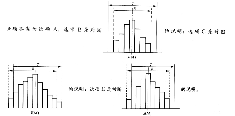 本题考核的是直方图的观察与分析。仔细观察题目中的直方图可知,B在T中间,实际数据分布与质量控制标准相比,两侧余地太大,说明加工过程过于精细,不经济。因此见下图。