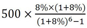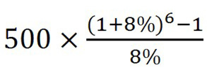 某投资者6年内每年年末投资500万元。若基准收益率为8%,复利计息,则6年末可一次性回收的本利和为()万元。