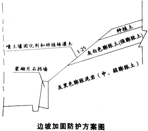 某高速公路膨胀土路堑段,长480m,挖深8~9m,右侧为顺层边坡,岩土层倾角为12°~15°,结构面内摩擦角为5°,黏聚力为12kPa。边坡加固防护方案如下图所示。