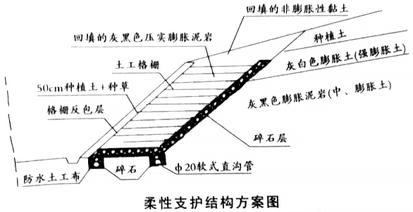 当年6月,在雨水作用下该边坡发生了部分滑坍,施工单位认为是原设计不合理所致,因此提出了下图所示柔性支护结构方案,并按相关程序报批变更设计。