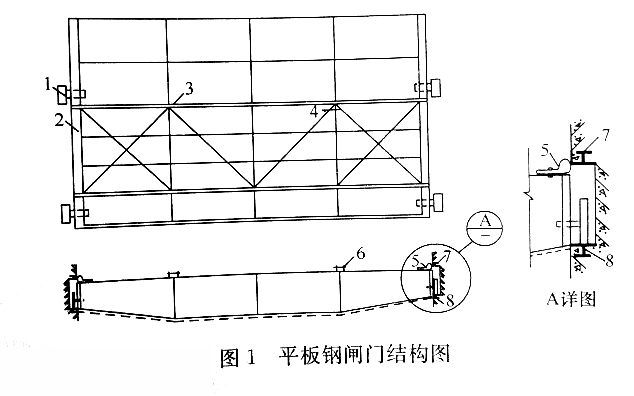 某大(2)型水库枢纽工程由混凝土面板堆石坝、电站、溢流坝和节制闸等建筑物组成,节制闸共2孔,采用平板直升钢闸板,闸门尺寸为净宽15m,净高12m,闸门结构如图所示。