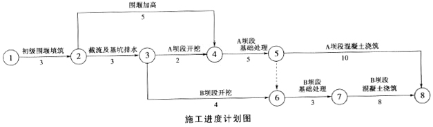 某水利枢纽工程由大坝、电站、泄洪洞(底孔)和溢流表孔等建筑物组成。为满足度汛要求,工程施工采取两期导流,一期工程施工泄洪底孔坝段(A)和溢流表孔坝段(B)。某承包人承担了该项(一期工程)施工任务,并依据《水利水电工程标准施工招标文件》(2009年版)与发包人签订了施工合同。合同约定:①签约合同价为4500万元,工期为24个月,2011年9月1日开工,2011年12月1日截流。②开通前,发包人按约定签约合同10%向承包人支付工程预付款,工程预付款的扣回与还清按R=A(C-F1S)/[(F2-F1)S]计算,其中F1=20%,F2=90%。③从第一个月起,按工程进度款5%的比例扣留工程质量保证金。由承包人编制,并经监理人批准的施工进度计划如下图所示(单位:月,每月按30天计)。