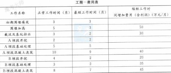 本工程在施工过程中发生以下事件:事件一:由于发包人未按时提供施工场地,造成了开工时间推迟,导致“初期围堰填筑”的延误,经测算“初期围堰填筑”要延至2012年1月30日才能完成。承包人据此向监理人递交了索赔意向通知书,后经双方协商达成如下事项:①截流时间推迟到2012年2月1日;②“围堰加高”须在2012年5月30日(含5月30日)前完成;③完工日期不变,调整进度计划;④承包人依据工期一费用表(见下表),重新编制新的施工进度计划,并提交了赶工措施和增加的费用,上报监理人并批准。