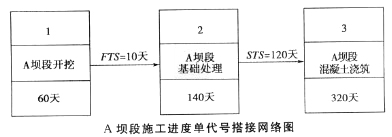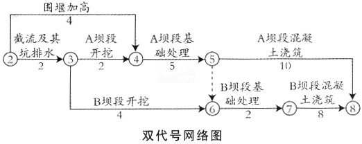 事件二:截至2012年2月底,累计完成合同金额为200万元;监理人确认的2012年3月份已完成工程量清单中“截流及基坑排水”的金额为245万元,“围堰加高”的金额为135万元,均含赶工增加费用。事件三:结合现场及资源情况,承包人对新的施工进度计划进行了局部调整,A坝段采用搭接施工,其单代号搭接网络如下图所示。