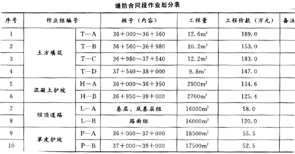 施工过程中发生如下事件:事件一:施工单位根据现场具体情况,将土方填筑、混凝土护坡、堤顶道路、草皮护坡工程施工分别划分为4个、2个、2个、2个作业组,具体情况如下表所示。
