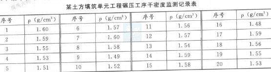 主体工程开工前,项目法人组织监理、设计、施工等单位对本合同段工程进行了项目划分。分部工程项目划分时,要求同种类分部工程的工程量差值不超过50%,不同种类分部工程的投资差额不超过1倍。事件二:因现有水利水电工程单元工程质量评定标准中无草皮护坡质量标准,施工单位在开工前组织编制了草皮护坡工程质量标准,由本工程质量监督机构批准后实施。事件三:工程开工后,施工单位按规范规定对土质堤基进行了清理。事件四:土方填筑开工前,对料场图样进行了击实试验,得出土料最大干密度为1.60g/cm3,设计压实度为95%。某土方填筑单元工程的土方填筑碾压工序干密度检测结果如下表所示,表中不合格点分布不集中;该工序一般项目检测点合格率为92%,且不合格点不集中;各项报验资料均符合要求。