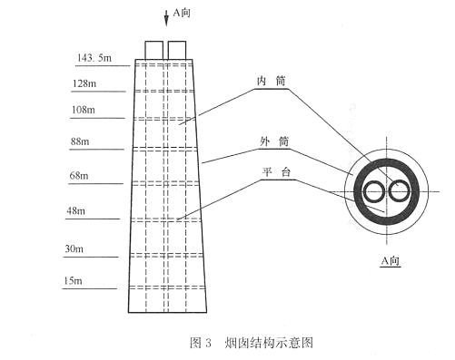 A公司承担某炼化项目的硫磺回收装置施工总承包任务,其中烟气脱硫系统包含的烟囱由外筒和内筒组成,外筒为钢筋混凝土筒壁,高145m;内筒为等直径自立式双管钢筒,高150m,内筒与外筒之间有8层钢结构平台,每层间由钢梯连接,钢结构平台安装标高,如图3所示。
