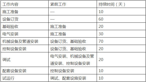 某制氧站经过招投标,由具有安装资质的公司承担全部机电安装工程和主要机械设备的采购。安装公司进场后,按合同工期、工作内容、设备交货时间、逻辑关系及工作持续时间(见下表)编制了施工进度计划。
