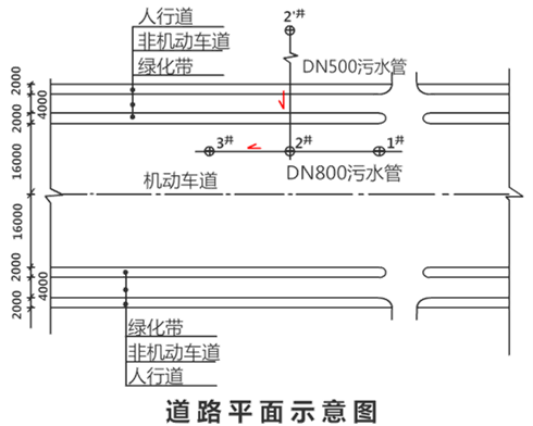 某公司承建长1.2km的城镇道路大修工程,现状路面面层为沥青混凝土,主要施工内容包括:对沥青混凝土路面沉陷、碎裂部分进行处理;局部加铺网孔尺10mm玻纤网以减少对新沥青面层的反射裂缝;对旧沥青混凝土路面铣刨拉毛后加铺厚40mmAC-13沥青混凝土面层,道路平面如图2所示。机动车道下方有一DN800mm污水干线,垂直于干线有一DN500mm混凝土污水管支线接入,由于污水支线不能满足排放量要求,拟在原位更新为DN600mm,更换长度50m,如图2中2#~2′#井段。