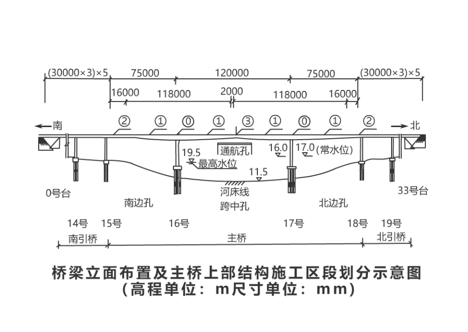 某公司承建一座城市快速路跨河桥梁,该桥由主桥、南引桥和北引桥组成,分东、西双幅分离式结构,主桥中跨下为通航航道,施工期间航道不中断。主桥的上部结构采用三跨式预应力混凝土连续刚构,跨径组合为75m+120m+75m;南、北引桥的上部结构均采用等截面预应力混凝土连续箱梁,跨径组合为(30m×3)×5;下部结构墩柱基础采用混凝土钻孔灌注桩,重力式U型桥台;桥面系护栏采用钢筋混凝土防撞护栏;桥宽35m,横断面布置采用0.5m(护栏)+15m(车行道)+0.5m(护栏)+3m(中分带)+0.5m(护栏)+15m(车行道)+0.5m(护栏);河床地质自上而下为厚3m淤泥质黏土层、厚5m砂土层、厚2m砂层、厚6m卵砾石层等;河道最高水位(含浪高)高程为19.5m,水流流速为1.8m/s。桥梁立面布置如下所示: