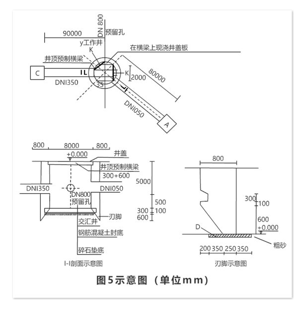 项目部承接一项顶管工程,其中DN1350mm管道为东西走向,长度90m;DN1050mm管道为偏东南方向走向,长度80m,设计要求始发工作井y采用沉井法施工,接收井A、C为其他标段施工(如图5示),项目部按程序和要求完成了各项准备工作。