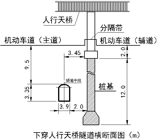 某公司承建城区防洪排涝应急管道工程,受环境条件限制,其中一段管道位于城市主干路机动车道下,垂直穿越现状人行天桥,采用浅埋暗挖隧道形式;隧道开挖断面3.9m×3.35m,横断面布置如图5所示。施工过程中,在沿线3座检查井位置施作工作竖井,井室平面尺寸长6.0m,宽5.0m。井室、隧道均为复合式衬砌结构,初期支护为钢格栅+钢筋网+喷射混凝土,二衬为模筑混凝土结构,衬层间设塑料板防水层。隧道穿越土层主要为砂层、粉质黏土层,无地下水。设计要求施工中对机动车道和人行天桥进行重点监测,并提出了变形控制值。