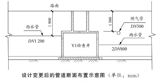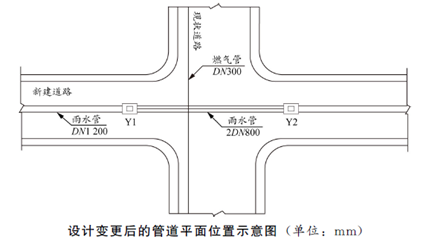 施工前,项目部踏勘现场时,发现雨水管道上部外侧管壁与现况燃气管道底间距小于规范要求,并向建设单位提出变更设计的建议。经设计单位核实,同意将道路交叉口处的Y1~Y2井段的雨水管道变更为双排DN800mm双壁波纹管,设计变更后的管道平面位置与断面布置如下图所示。项目部接到变更后提出了索赔申请,经计算,工程变更需增加造价10万元。