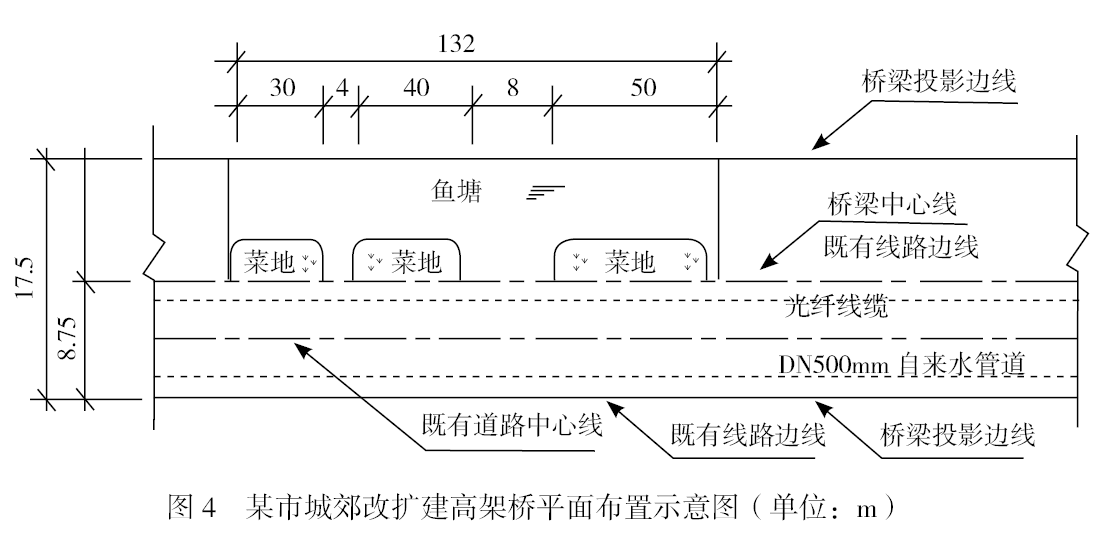 某公司中标承建该市城郊接合部交通改扩建高架工程,该高架上部结构为现浇预应力钢筋混凝土连续箱梁,桥梁底板距地面高15m,宽17.5m,主线长720m,桥梁中心轴线位于既有道路边线,在既有道路中心线附近有埋深1.5m的现状DN500自来水管道和光纤线缆,平面布置如下图所示。高架桥跨越132m鱼塘和菜地,设计跨径组合为41.5+49+41.5m,其余为标准联,跨径组合为(28+28+28)m×7联,支架法施工。下部结构为:H型墩身下接10.5m×6.5m×3.3m承台(埋深在光纤线缆下0.5m),承台下设有直径1.2m,深18m的人工挖孔灌注桩。