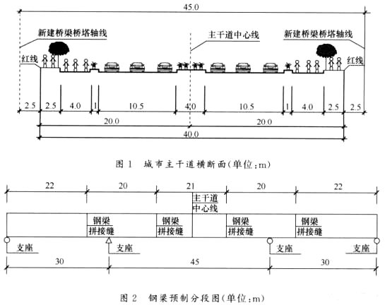 某公司低价中标跨越城市主干道的钢-混凝土结构桥梁工程,城市主干道横断面如图1-1所示。三跨连续梁的桥跨组合:30+45+30,钢梁(单箱单室钢箱梁)分5段工厂预制、现场架设拼接,分段长度22+20+21+20+22。桥面板采用现浇后张预应力混凝土结构,由于钢梁拼接缝位于既有城市主干道上方,在主干道上设置施工支架、搭设钢梁段拼接平台对现状道路交通存在干扰问题。针对本工程的特点,项目部编制了施工组织设计方案和支架专项方案,支架专项方案通过专家论证。依据招标文件和程序将钢梁加工分包给专业公司,签订了分包合同。