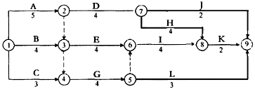 ,本题考查的是双代号网络计划。关键线路有:A→D→H→K,A→E→I→K,A→G→I→K。所以选B。