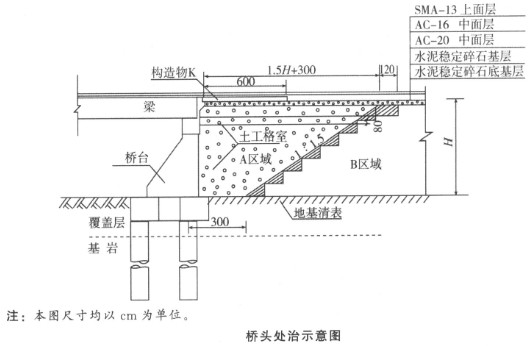 某施工单位承接了一条二级公路的施工,路线全长30.85km,路基宽度为8.5m,路面宽度为2×3.5m。该工程内容包括路基、桥梁及路面工程等。为减少桥头不均匀沉降,设置桥头跳车,桥台与路堤交接处按下图施工,主要施工内容包括地基清表、挖台阶、A区域分层填筑、铺设土工格栅、设置构造物K、路面铺筑等。路面结构层如下图所示,B区域为已经填筑完成的路堤填筑区域。