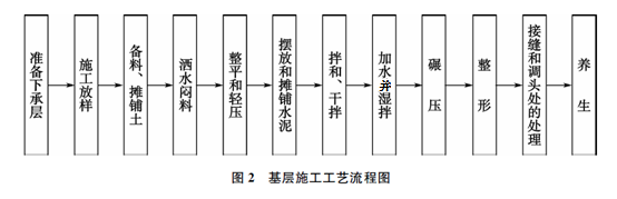 基层采用路拌法施工,施工工艺流程见图2。为顺利完成基层的施工,施工单位配备了稳定土拌和机,装卸机,运输车,多铧犁。