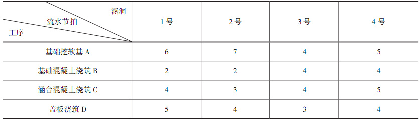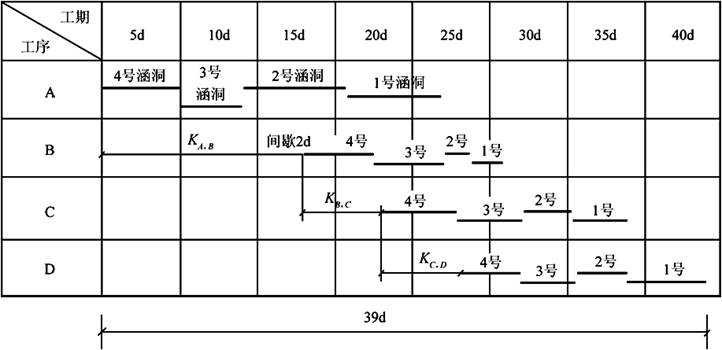 施工单位最初计划采用顺序作业法组织施工,报监理审批时,监理认为不满足工期要求,要求改为流水作业法。根据现场施工便道情况,施工单位决定分别针对A、B、C、D四道工序组织四个专业作业队伍,按4号→3号→2号→1号涵洞的顺序采用流水作业法施工,确保每个专业作业队的连续作业。在每个涵洞的“基础开挖及软基换填”工序之后,按《隐蔽工程验收制度》规定,必须对基坑进行检查和验收,检查和验收时间(间歇时间)按2天计算。验收由施工单位项目负责人组织施工人员、质检人员,并请监理单位人员及设计代表参加。验收的项目为:基坑几何尺寸、地基处理。验收合格后才进行下一道工序的施工。