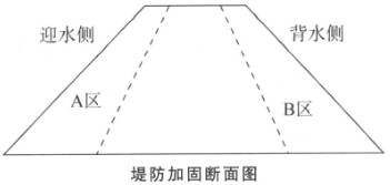 某堤防加固工程划分为一个单位工程,工程建设内容包括堤防培厚、穿堤涵洞拆除重建等。堤防培厚采用在迎水侧、背水侧均加培的方式,如下图所示。根据设计文件,A区的土方填筑量为12万m³,B区的土方填筑量为13万m³。