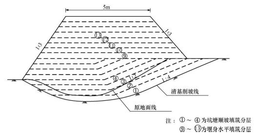 2.根据《堤防工程施工规范》(SL260-2014),指出并改正事件2图4中坑塘部位在清基、削坡、分层填筑方面的不妥之处。