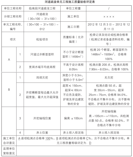 事件3:河道疏浚工程施工中,施工单位对某单元工程进行了质量评定,如表4所示。
