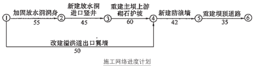 某中型水库除险加固工程主要工程内容包括:加固放水洞洞身,新建放水洞进口坚井、改建溢洪道出口翼墙,重建主坝上游砌石护坡,新建防浪墙和重建坝顶道路等工作。签约合同价为580万元,合同工期8个月,2011年12月1日开工,合同约定:(1)为保证安全度讯,除新建防浪墙和重建坝顶道路外,其余工作应在2012年5月15日前完成;(2)工程预付款为签约合同价的10%,当工程进度款累积达到签约合同的50%时,从超过部分的工程进度款中按40%扣回工程预付款,扣完为止,工程进度款按月支付,按工程进度款的5%扣留工程质量保证金。承包人依据合同制定并经监理单位批准的施工网络进度计划如图1(单位:天,每月按30天计);