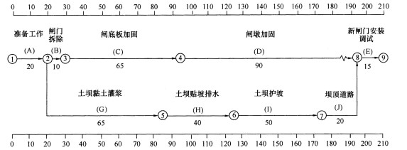 某水库除险加固工程内容有:(1)溢洪道的闸墩与底板加固,闸门更换;(2)土坝黏土灌浆、贴坡排水、护坡和坝顶道路重建。施工项目部根据合同工期、设备、人员、场地等具体情况编制了施工总进度计划,形成的时标网络图如下(单位:天)。