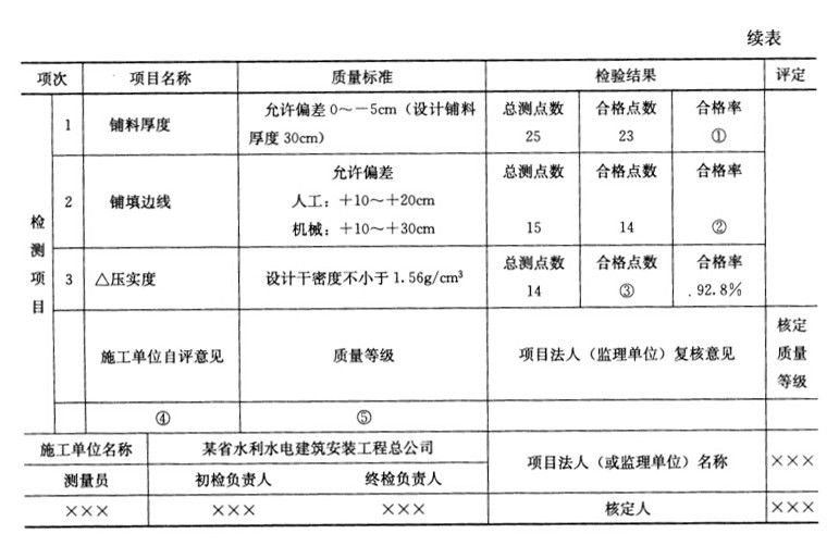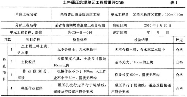 某省曹山湖堤防退建工程为3级,新建堤防填筑土料为黏性土,最大干密度为1.69g/cm³,最优含水率为19.3%,设计压实干密度为1.56g/cm³。该工程项目划分为一个单位工程,5个分部工程。某省水利水电建筑安装工程总公司承建该工程第Ⅱ标段。第Ⅱ标段为该工程的一个分部工程,堤防长度2.5km,土方填筑量50万m³;其中编号为CS-Ⅱ-016的单元工程桩号为CS10+000~CS10+100,高程为▽18.5m~▽18.75m,宽度为40m,土方填筑量为1000m³。施工过程中发生了如下事件:事件1:施工单位于当年12月进场,当地气温在-5℃左右。土方填筑前,施工单位按照强制性标准的要求对堤基进行了处理。事件2:施工单位按照《堤防工程施工质量评定与验收规程》(试行)SL239―1999的规定,对CS-Ⅱ-016单元工程质量进行了检查和检测,相关结果填于表1中。事件3:该分部工程施工结束后,根据《水利水电工程施工质量检验与评定规程》SL176-2007的规定,对该分部工程质量进行了评定,质量结论如下:该分部工程所含418个单元工程质量全部合格,其中276个单元工程量等级优良,主要单元工程和重要隐蔽单元工程质量优良率为86.6%,且未发生过质量事故。经施工单位自评,监理单位复核,工程质量和安全监督机构核定,本分部工程质量等级为合格。事件4:该单位工程完工后,项目法人主持进行了单位工程验收。验收工作组由项目法人、勘测、设计、监理、施工、质量和安全监督机构、运行管理单位、法人验收监督管理机关等单位的代表及上述单位外的3名特邀专家组成。