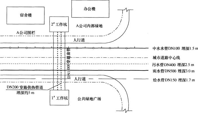 某市政供热管道工程,供回水温度为95℃/70℃,主体采用直埋敷设。管线经过公共绿地和A公司场院,A公司院内建筑密集、空间狭窄。供热管线局部需穿越道路,道路下面敷设有多种管道。项目部拟在道路两侧各设置1个工作坑,采用人工挖土顶管施工,先顶入DN1000mm混凝土管作为过路穿越套管,并在套管内并排敷设2根DN200mm保温供热管道(保温后的管道外径为320mm)。穿越道路工程所在区域的环境条件及地下管线平面布置如下图所示,地下水位高于套管管底0.2m。