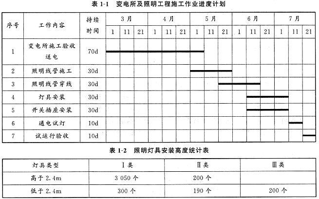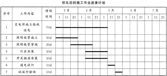 某建设项目由A公司施工总承包,A公司征得业主同意,把变电所及照明工程分包给B公司。分包合同约定,电力变压器、配电柜等设备由A公司采购;灯具、开关、插座、管材和电线电缆等由B公司采购。B公司项目部进场后,按公司的施工资源现状,编制了变电所及照明工程施工作业进度计划(见表1-1),工期需150天,在审批时被A公司否定,要求增加施工人员,优化变电所及照明工程作业进度计划,缩短工期。B公司项目部按A公司要求,在工作持续时间不变的情况下,将照明线管施工的开始时间提前到3月1日,变电所和照明工程平行施工。