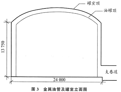 油罐布置在一条主巷道两侧的罐室中,罐室尺寸如图3所示,由支巷道进入罐室,支巷道剖面尺寸为3.6m×3.9m(宽×高),安装操作空间相当狭小,另支巷道毛地面不平坦,运输和吊装困难,且罐室内无通风坚井,必须通过支巷道通风换气。
