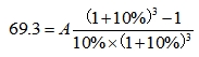 计算分两步:第一步,现将第1年初的30万元和第1年年末的30万元按复利分别计算其第2年年末(第3年初)的终值:万元;万元;第2年年末(第3年年初的现值)的终值F=36.3+33=69.3(万元);第二步,已知现值P(69.3万元),i(10%),n(3),求年金A,,A=27.87(万元)。