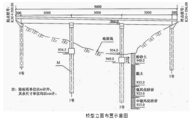 某施工单位承建了一段二级公路,其中1号桥梁起讫桩号为K30+500~K30+596,桥型立面布置示意图如图所示。该桥为单箱双室现浇预应力混凝土连续箱梁,下部结构为薄壁式桥墩,轻型桥台,桥梁纵坡为1%,2号墩承台尺寸为8m×3.6m×3.5m(横桥向×纵桥向×高)。地下水位高程为953.0m,上部结构采用满堂式支架现浇施工。
