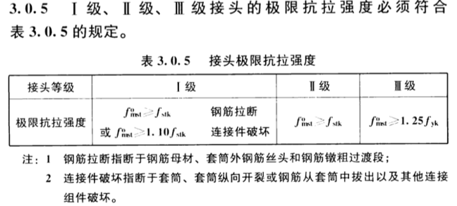 (1)I级,接头抗拉强度应不小于钢筋极限抗拉强度标准值(钢筋拉断时)或不小于1.10倍钢筋抗拉强度标准值(连接件破坏时),残余变形小并具有高延性及反复拉压性能。