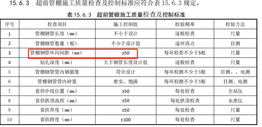 根据《公路隧道施工技术规范》(JTG/T3660-2020),超前管棚施作时,钢管环向间距布置质量检查控制指标是()。