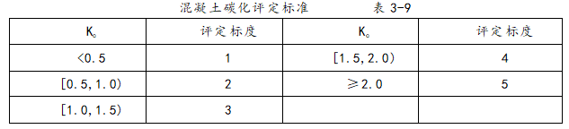 混凝土碳化深度对钢筋锈蚀影响的评定,可取构件的碳化深度平均值与该类构件保护层厚度平均值之比Kc,并考虑其离散情况,参考表3-9对单个构件进行评定。